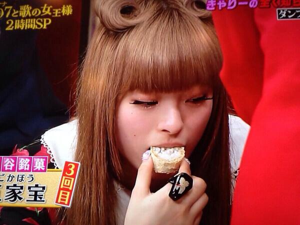 「しゃべくり007」に出演した、きゃりーぱみゅぱみゅが五家宝を食べ